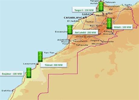 Les cinq sites sont situés à Tanger (100 MW), Essaouira (200 MW), Midelt (150 MW), Tiskrad (300 MW) et Boujdour (100 MW). Les deux derniers se trouvent dans le Sahara occidental contesté.L'offre comprend également une option pour fournir et maintenir des turbines pour l'extension de 200 MW prévue de la Koudia Al Baida éolien près de Tanger.